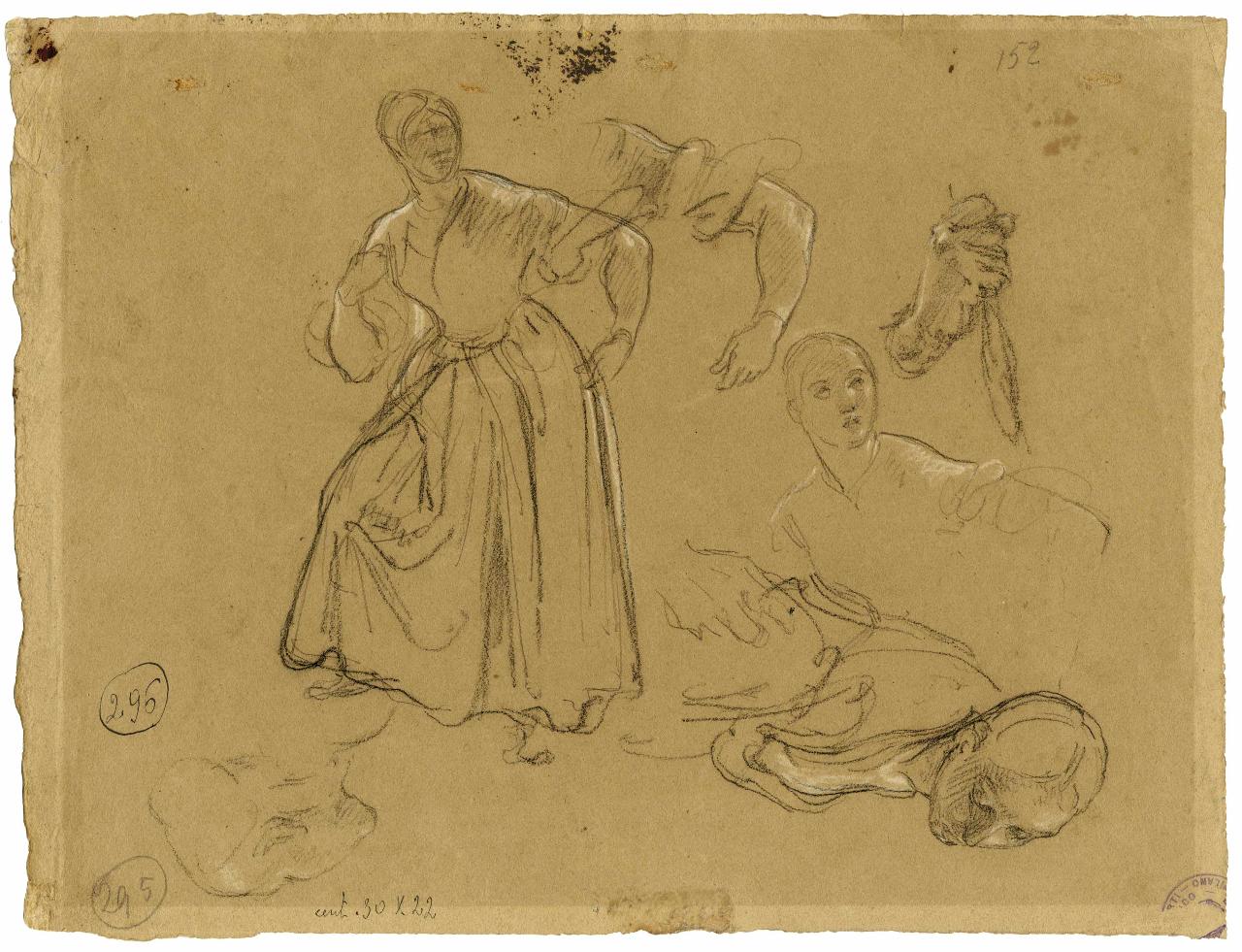 Figura di donna e studi di braccia e mani; teste e mezze figurine di donne. figure femminili, braccia, mani, teste