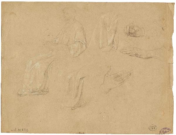 Studi di personaggio seduto, panneggi e mani/ Schizzo di ignudo e mezze figure varie tra cui tre testine di giovane donna. figura maschile, panneggio e mani | nudo maschile e teste femminili