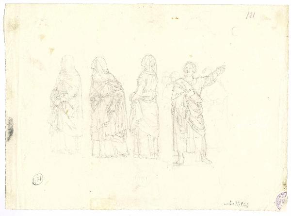 Studi di costumi: donne all'impiedi e uomo in atto di parlare. figure femminili e figura maschile