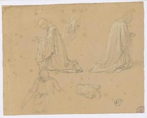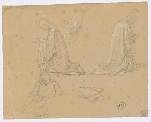 Studi di donne genuflesse preganti, mani e mezza figura virile/ Donna seduta. figure femminili, figura maschile, mani | figura femminile