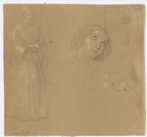 Donna all'impiedi e due testine (dal vero)/ Studio di figura virile. figura femminile in piedi, teste | figura maschile