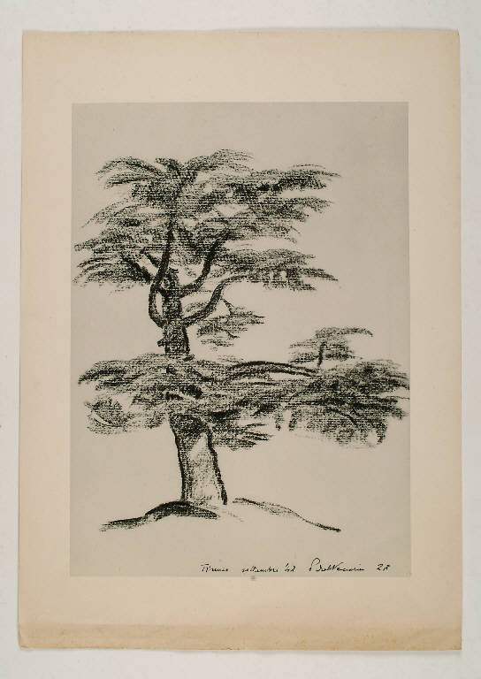 Riproduzione meccanica in fotolitografia dello studio di un albero, probabilmente un cedro del Libano, realizzata su sfondo grigio. Una spessa linea di contorno nera delimita il terreno, il tronco e i rami dell'albero. Sul lato sinistro del fusto la linea si fa più sottile in modo da conferire maggior effetto prospettico al disegno. Il segno è invece più sfumato e chiaroscurato nel tronco e nel fogliame, così da dare senso di profondità attraverso il contrasto tonale.