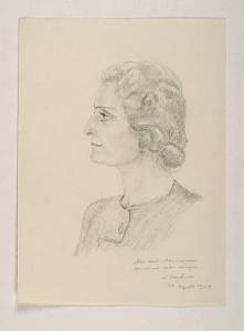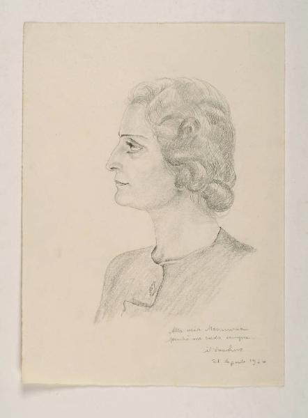 L'attenzione dell'autore è concentrata sul volto di profilo della madre, rivolto a sinistra, lievemente sorridente, con il naso appena arquato e i larghi occhi dalle lunghe ciglia. I suoi capelli sono ondulati sulla nuca e scendono mossi fino al collo. Il busto è appena accennato nel disegno della spalla destra mentre appare tagliato in corrispondenza della sinistra. La donna indossa un abito sobrio ed elegante, con un bottone quadrato sul davanti e tagliato a girocollo. Si può rilevare una forte somiglianza con il disegno di donna seduta alla finestra ma qui l'impronta ritrattistica e la compitezza del disegno sono più evidenti.Il segno è infatti più preciso e pulito nelle linee di contorno ed anche il chiaroscuro è più morbido e soffice. Nel volto la matita sfuma lievi ombre mentre le ciocche dei capelli sono delineate con segni curvi e diagonali, scuri e netti. Anche l'abito è reso a tratteggio, ma con andamento diagonale più morbido e leggero.