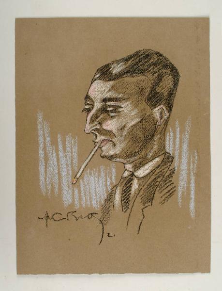 Un uomo, con una lunga e sottile sigaretta pendente tra le labbra, è ritratto di tre quarti a mezzo busto. Lo \nsfondo è quello bruno del supporto cartaceo, rialzato cromaticamente da alcuni brevi e rapidi tratti verticali a gessetto bianco ai lati della figura. Anche\nil volto, delineato a carboncino, è lumeggiato sulla parte anteriore, in modo da produrre l'effetto di un'illuminazione artificiale 'notturna'. Il segno nero contorna forme e tratteggia la giacca e la cravatta del personaggio, le ombre nel volto e si fa più fitto nella definizione delle ciocche dei capelli.\nTracce di gessetto rosa sono utilizzate nelle labbra mentre il rosso serve a definire appena la brace della sigaretta. Il linguaggio è registrato sulle deformazioni espressive del volto che mirano a conferire tenebrosità al personaggio crando un'atmosfera da romanzo 'noir', prossima a quella che si registra nell'espressionismo tedesco degli anni Venti, e forse modellata sui personaggi del grande schermo.