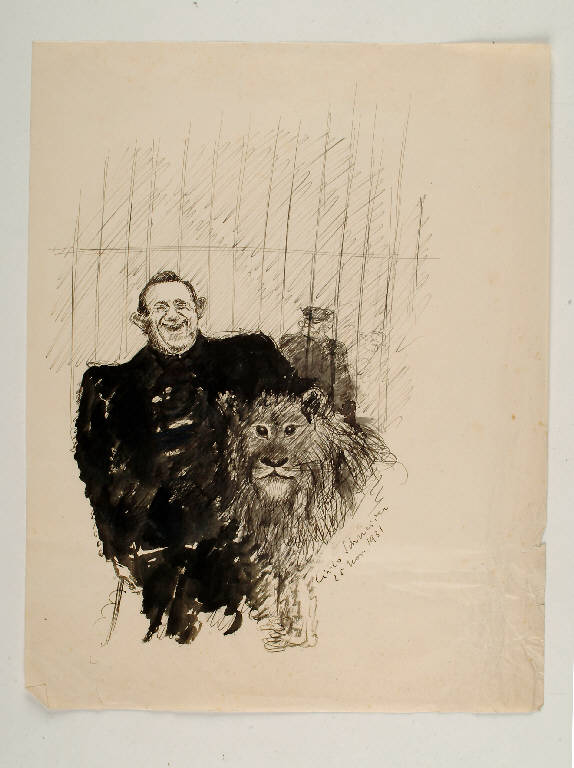 Un robusto e sorridente domatore in divisa ed il suo leone sono ritratti in primo piano. Alle loro spalle si scorgono le sbarre verticali di una gabbia al di là delle quali s'intravede un'altra figura, appena accennata da una pennellata d'inchiostro diluito e\nda qualche tratto di penna. Il pennello delinea anche il corpo del domatore sopra tratti a penna relizzati in precedenza e, sommariamente, la struttura del leone mentre, il volto dell'uomo ed il pelo del felino, sono tratteggiati a penna. Anche le sbarre e lo sfondo sono realizzati al tratto. E' questo dunque uno schizzo realizzato con tecnica rapida, che riesce a cogliere sia l'espressività un po' grottesca e caricaturale del domatore, sia la fissità dello sguardo della fiera in cattività.