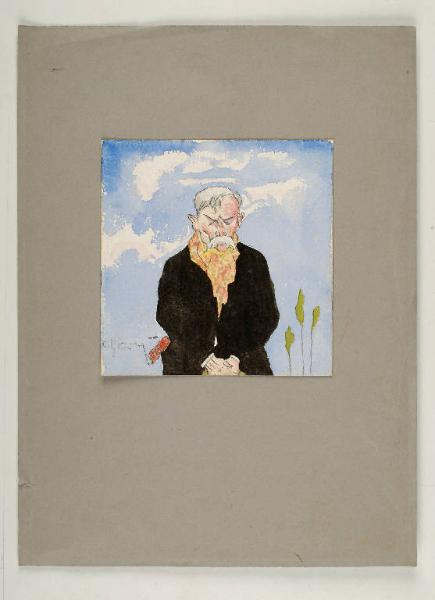 Il piccolo acquerello di formato quasi quadrato mostra un uomo anziano, dai capelli e dai lunghi baffi bianchi, ritratto in piano americano. Il bordo \ninferiore del disegno taglia infatti la figura all'altezza delle mani, unite, in corrispondenza dell'inguine.L'uomo indossa un soprabito nero ravvivato da una sciarpa che porta annodata al collo e colorata con motivi di fantasia in verde, rosa giallo ed arancio. Un fazzoletto rosso fuoriesce dalla tasca destra. Il volto del personaggio è scavato; lo sguardo abbassato e gli occhi chiusi ne caratterizzano l'espressione triste ed assorta. La figura è ritagliata su un cielo azzurro, solcato da nuvole bianche. In basso a destra s'intravedono le sagome stilizzate di tre alberi dalle fronde verdi. Una linea di contorno a matita, spigolosa ed angolata, delinea il volto, mentre la massa scura del corpo si stacca senza delimitazione sul cielo, solo per forza di contrasto cromatico.