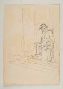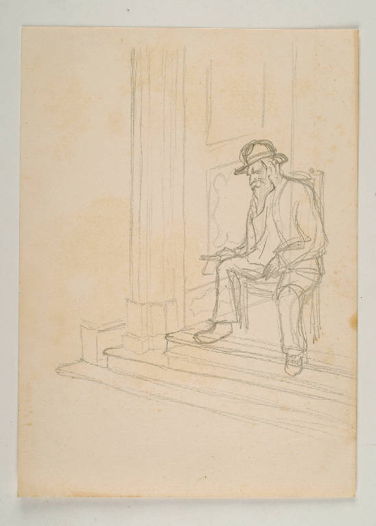 Un uomo anziano, con cappello, lunga barba e capelli bianchi è ritratto seduto, sulla soglia di un portone. Lo schizzo lo coglie sui gradini, con taglio diagonale che mostra, a sinistra, il battente e lo stipite dell'ingresso. Il personaggio è a tutta figura, lievemente arretrato e tiene un libro nella mano destra, con l'indice tra le pagine. Ha le gambe divaricate ed il corpo in leggera rotazione verso sinistra. La testa accompagna il movimento fino a mostrarne il profilo. Il disegno è rapido e sommariamente abbozzato nella figura, con insistiti e nervosi passaggi a matita che si fanno più netti e precisi nei dettagli architettonici, così da rivelare l'immediatezza del disegno che coglie il personaggio nell'istante in cui la lettura è sospesa e lascia il posto alla meditazione.