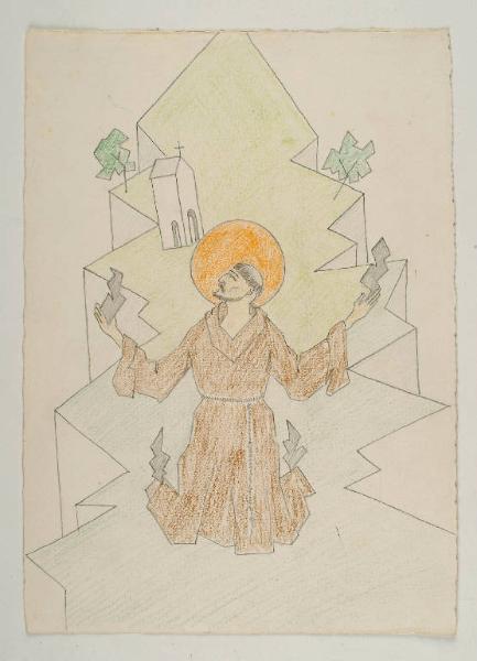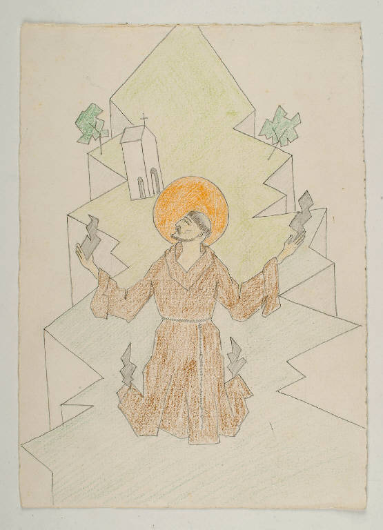 Sul recto del foglio il Santo è ripreso frontalmente, inginocchiato, a braccia aperte e con i palmi delle mani rivolti versol'alto. Indossa un saio marrone e, in corrispondenza delle mani e dei piedi, compaiono quattro fiammelle grigie stilizzate a simboleggiare le stigmate ricevute da Francesco. Il capo del santo è circoscritto da un'aureola arancione ed il suo volto è caratterizzato da una corta barba. La figura è collocata in primo piano su una montagna stilizzata dal profilo frastagliato e spezzato, che sembra ribaltarsi verso lo spettatore. Un edificio a torre con due aperture centinate e sormontato da una croce si erge a sinistra vicino ad un alberello geometricamente stilizzato. Un albero analogo compare sul versante opposto del monte. Il disegno dal sapore quasi infantile, mescola elementi più naturalistici, come l'anatomia del Santo, ad elementi più 'primitivi', quali la geometrizzazione del paesaggio, che paiono richiamare le tavole degli antichi maestri.