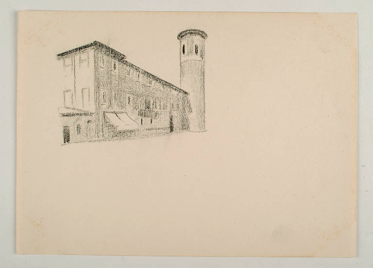 Il disegno è tracciato nel quarto superiore del foglio, come se si trattasse di un bozzetto lasciato incompleto. L'edificio è infatti realizzato con precisione architettonica e prospettica, chiaroscurato a matita e ripassato, con un segno più marcato, nelle parti più ombreggiate delle linee di gronda dei tetti e delle finestre. Si tratta di una veduta di scorcio del settecentesco palazzo Prinetti a Merate, un edificio a tre piani, ripreso in prospettiva con punto di fuga a destra, culminante nell'alta torre cilindrica, detta Torre di Merate, caratterizzata da una fascia di monofore nella zona superiore.