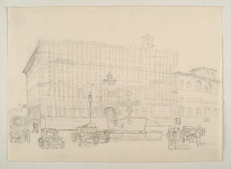 Veduta del cinquecentesco Palazzo Farnese ,\nla cui facciata, a tre ordini di finestre, è interamente ricoperta da un'impalcatura. L'edificio è ripreso per angolo sullo sfondo della piazza nella quale campeggia, in primo piano, una delle due monumentali fontane che la ornano, costruite con vasche di granito provenienti dalle Terme di Caracalla. Alla sua destra sono disegnate tre vetture d'epoca, mentre, sul lato opposto, tre uomini sono ritratti vicino ad un cavallo con calesse. Sullo sfondo, più a destra lungo la prospettiva del palazzo, si scorge un altro edificio più basso con un'altana nella parte superiore. Il "dado Farnese", considerato una delle quattro meraviglie di Roma, venne iniziato da Antonio da Sangallo il giovane nel 1514 e continuato nel 1546 da Michelangelo, a cui si devono il finestrone ed il cornicione della facciata. Dal 1911 fu sede dell'ambasciata di Francia e, nel 1936, lo stato italiano lo riacquistò. Il disegno potrebbe essere di poco precedente questa data.