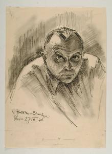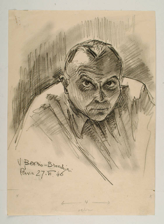 Ritratto a matita di Beonio-Brocchieri, che dal 1942 ha insegnato storia delle dottrine politiche\nall'Università di Pavia e che fu apprezzato collaboratore del 'Corriere della Sera' e di altre riviste. Lo scrittore lodigiano è ripreso frontalmente,\na mezzo busto, con la spalla destra leggermente avanzata, in una posa tipicamente fotografica. Le indicazioni sulla retinatura a matita aggiunte in basso rivelano che il disegno servì, probabilmente, per una fotoincisione. La fisionomia del volto del personaggio è resa con una tecnica rapida, quasi bozzettistica, ma precisa nel restituire il dettaglio e l'intensità psicologica dello sguardo. Il disegno è delineato a matita, ombreggiato e, successivamente, ripassato con un segno più marcato nei contorni e nei dettagli del viso .