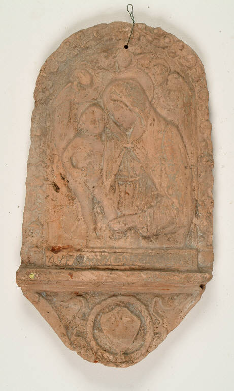 cornice a ghirlanda di rose con mensola e base sagomata ornata da stemma entro scudo (aquila?) clipeato d'alloro e nastri svolazzanti