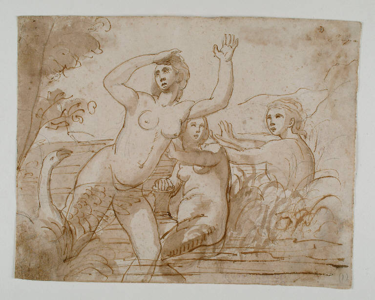 - NOTIZIE STORICO CRITICHE Il disegno raffigura lo strazio delle ninfe per la morte di Fetonte, poco prima che Zeus le trasformi in pioppi, le essenze tipiche delle rive dell'Eridano; un tema mitologico di evidente ispirazione neoclassica. Influenze dello stesso tipo sono rintracciabili nella scelta della tecnica, che riprende l'uso della penna e del pennello tipico di Füssli. In passato il tema del disegno era stato interpretato come una raffigurazione di "Leda e il cigno", e collegato ad altri presenti nella stessa collezione, anch'essi ritenuti rappresentazioni del medesimo mito, oggi invece interpretati (CASARIN, 2003, pp. 32-33) come un'altra variante sul tema delle Eliadi (vd.0300144671) e come episodi legati alla nascita e al mercato degli amorini (vd.0300144673 e 0300144674).