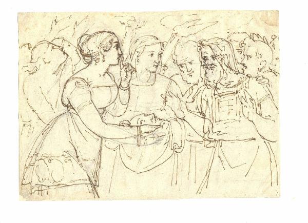 - NOTIZIE STORICO CRITICHE Giuditta è colta nell'atto di lodare Dio per ciò che le ha permesso di fare, esattamente come accade nel racconto biblico. Il disegno vi si mostra dunque più aderente rispetto a quello sul retto della tavola. Diversa è anche la tecnica, a penna, che determina una resa più compendiaria e meno curata nello studio del chiaroscuro.
