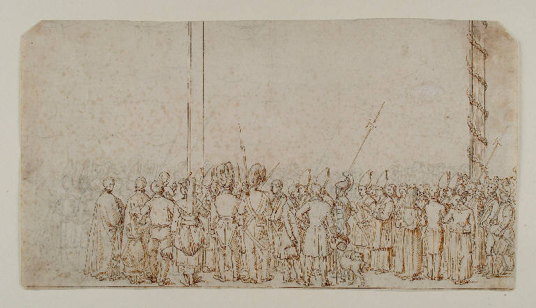 - NOTIZIE STORICO CRITICHE Il disegno fa parte di un ciclo di nove fogli (Bellini nell'inventario del 1946 ne indica sette, ma due fogli riportano varianti di alcune scene) raffiguranti la processione del Corpus Domini, che si snodava dall'Ospizio di San Michele a Roma, sede di una scuola artistica per giovani poveri. Ogni disegno si concentra su un momento preciso, e molto spesso la lettura è aiutata da didascalie, anche se la lettura da destra a sinistra talvolta rende problematica l'individuazione della corretta sequenza delle scene, così come i tentativi di numerazione (numeri e lettere a matita) operati dal Bellini e dai suoi successori, nei quali si sono registrate incongruenze. L'attenzione si concentra sulla descrizione delle classi sociali romane: dalle gerarchie ecclesiastiche, ai soldati, ai popolani, sul modello delle stampe popolari dell'epoca. Il taglio orizzontale aiuta a far spaziare lo sguardo tra la folla, e il movimento è dato dalle diverse altezze di croci, aste e baionette, e dallo sguardo che alcuni personaggi lanciano allo spettatore. Gli ultimi studi (CASARIN, 2003, pp. 98-99) hanno proposto una nuova datazione del ciclo, basandosi sulla presenza nei disegni di truppe con l'uniforme austriaca: si tratterebbe delle truppe giunte a Roma nel 1825 per il Giubileo (di cui Impaccianti raffigura l'apertura della Porta Santa, vd. 0300141860) di ritorno dal Regno delle Due Sicilie, dove avevano represso moti carbonari (vd. anche 0300144710).