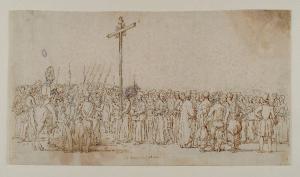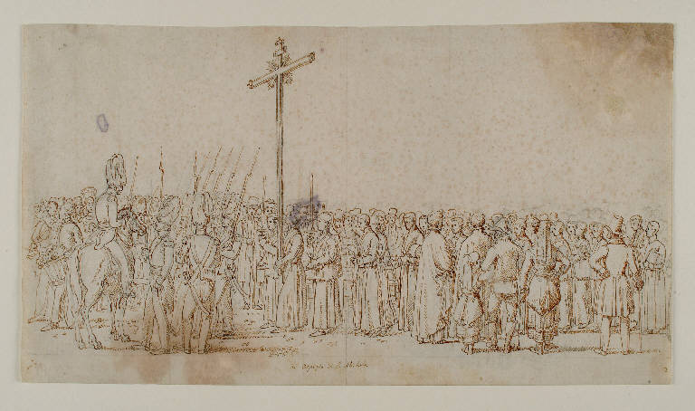 - NOTIZIE STORICO CRITICHE Il disegno raffigura la prima tappa del corteo romano del Corpus Domini (vd. 0300144706), a cui Impaccianti dedica un intero ciclo, che, specie nelle prime tavole, si sofferma con particolare attenzione sulle classi subalterne. Si tratta forse delle opere di maggior qualità del pittore romano, interessanti anche per le scelte compositive.