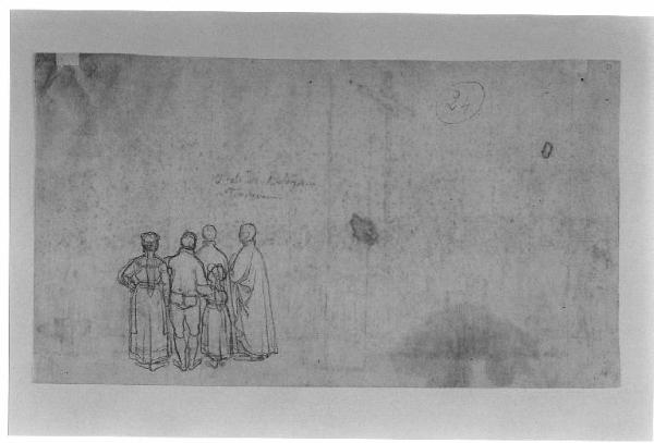 - NOTIZIE STORICO CRITICHE Il disegno riporta uno studio preparatorio per le figure degli astanti del ciclo raffigurante "Il corteo del Corpus Domini" (vd. 0300144706), una scena del quale si trova al retto dello stesso foglio. In particolare questo gruppo si ritrova al retto e, con qualche variante, all'estrema sinistra del n. 0300144706.