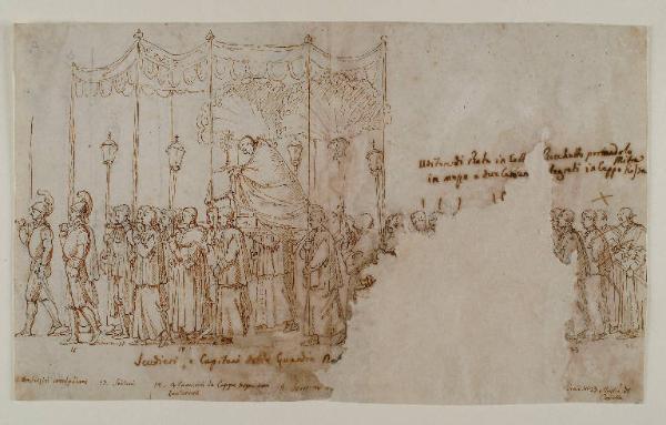- NOTIZIE STORICO CRITICHE Il Papa raffigurato da Impaccianti è stato riconosciuto come Leone XII°, salito al soglio pontificio nel 1823, il pontefice che celebrò il Giubileo del 1825, altro elemento che può consolidare la tesi di una datazione a quell'anno (CASARIN, 2003, pp. 98-99; vd. anche 0300144706). Era un papa molto popolare, e forse proprio per questo l'accento in questi disegni cade sulla partecipazione di tutte le classi sociali alla cerimonia.