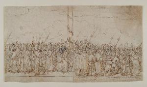 penna, inchiostro bruno, tracce di matita su carta bianca