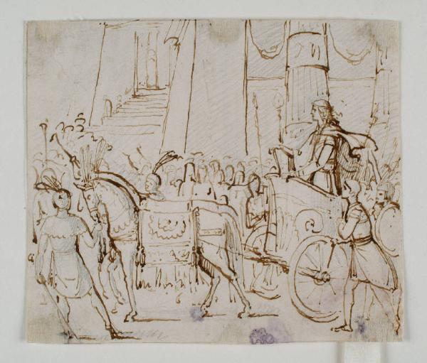 - NOTIZIE STORICO CRITICHE Il disegno rappresenta personaggi vestiti all'antica su uno sfondo di architetture classiche; è stata avanzata l'ipotesi che il condottiero sia Alessandro Magno (CASARIN, 2003, pp. 108-109). Il contesto classicheggiante lo inserisce nella prima fase della produzione di Luigi Impaccianti, cui l'opera è attribuita, per analogia stilistica con altre opere.