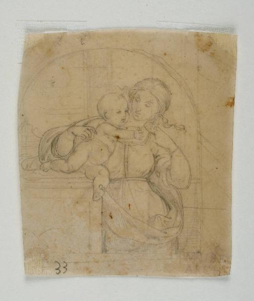 - NOTIZIE STORICO CRITICHE Il disegno, assegnato al mantovano Giovanni Sanguinetti (CASARIN, 2003, pp. 148-149) in occasioine della mostra del 2003, è ispirato a modelli raffaelleschi, specie della Madonna detta "La bella giardiniera" conservata al Luovre, poi filtrati attraverso la cultura neopurista di Minardi, che anch'esso realizzò uno studio di quest'opera.
