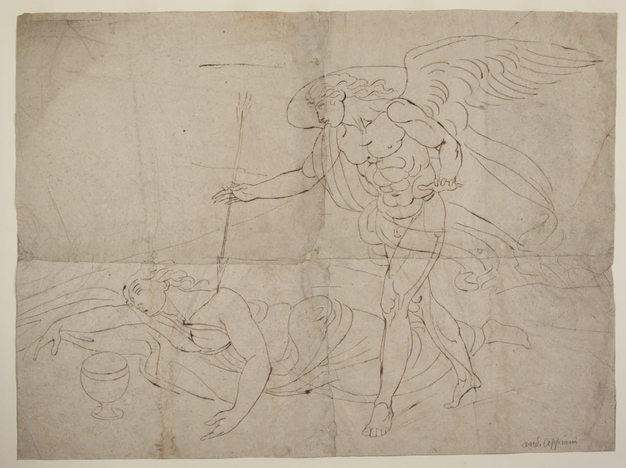 - NOTIZIE STORICO CRITICHE Nel 1792 Appiani fu chiamato dall'arciduca d'Austria Ferdinando d'Asburgo-Este a decorare la Rotonda della Villa Reale di Monza con una serie di soggetti derivati dall'Asino d'oro di Apuleio, e, in particolare, dalle Storie di Psiche. L'artista dipinse le scene all'interno di riquadri rettangolari e di vele triangolari, tra cui Amore desta Psiche, di cui questo grande foglio rappresenta uno studio preparatorio. L'autore ha definito la struttura della scena, prossima all'affresco, scegliendo, mediante l'adozione della pura linea, di non soffermarsi su dettagli minuti o l'impianto luministico. Colpisce l'abilità di Appiani nel trasmettere la plasticità delle figure facendo ricorso a limitati artifici grafici.