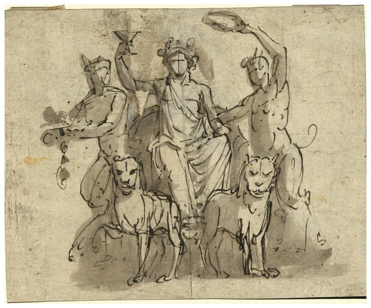 - NOTIZIE STORICO CRITICHE Sempre identificato come Trionfo di Arianna, il disegno potrebbe raffigurare in realtà il Trionfo di Bacco, ipotesi suffragata dagli attributi - il calice sollevato, la corona di foglie di vite o di edera - tipici della divinità maschile, e dalla presenza dei due satiri a formare il corteo. Lo stile, connotato da una vivacità di tratto tipicamente settecentesco e affine a quello utilizzato nel disegno raffigurante le Tre muse (B 36), pare disancorare l'opera dal catalogo appianesco. Seppur appaia plausibile l'ipotesi di Precerutti (1969), che daterebbe l'opera al periodo giovanile dell'autore, sarebbe preferibile assegnare l'opera a un anonimo autore italiano di fine Settecento.