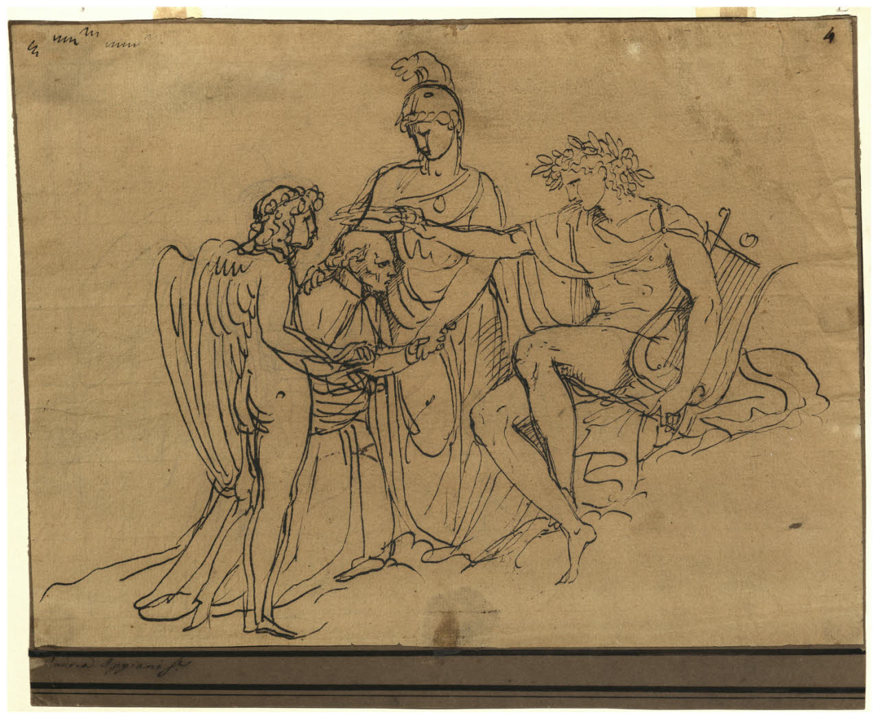 - NOTIZIE STORICO CRITICHE La composizione allegorica è una delle due versioni disegnate da Appiani dedicate all'Incoronazione di Parini. Il soggetto, secondo Francesco Leone (Andrea Appiani pittore di Napoleone, pp. 68-69), fu eseguito dall'autore come omaggio nei confronti dell'intellettuale e letterato appena deceduto e sarebbe quindi databile al 1799-1800, in prossimità della sua morte. Il legame tra lo scrittore e l'artista fu molto profondo. La stima di cui godeva Appiani presso il poeta fu reciproca, come testimoniano i numerosi ritratti sopravvissuti (in cui è ripreso due volte frontalmente e una di profilo, si veda il disegno del Civico Gabinetto dei Disegni del Castello Sforzesco C 18). La scena è incentrata sulla figura del Parini che, sebbene appaia di dimensioni leggermente minori rispetto alle divinità mitologiche, catalizza l'attenzione. È incoronato al cospetto di Apollo, che gli cinge la corona di alloro sul capo, e accompagnato da Minerva e da Amore. La critica si è soffermata sull'equilibrio compositivo, sull'elegante concatenazione dei gesti dei protagonisti, nonché sull'etereo ritratto del Parini, appena accennato e definito nei suoi tratti peculiari. Il disegno è da mettere in relazione con una seconda versione dell'Incoronazione (B 58), conservata presso il Civico Gabinetto dei Disegni del Castello Sforzesco.