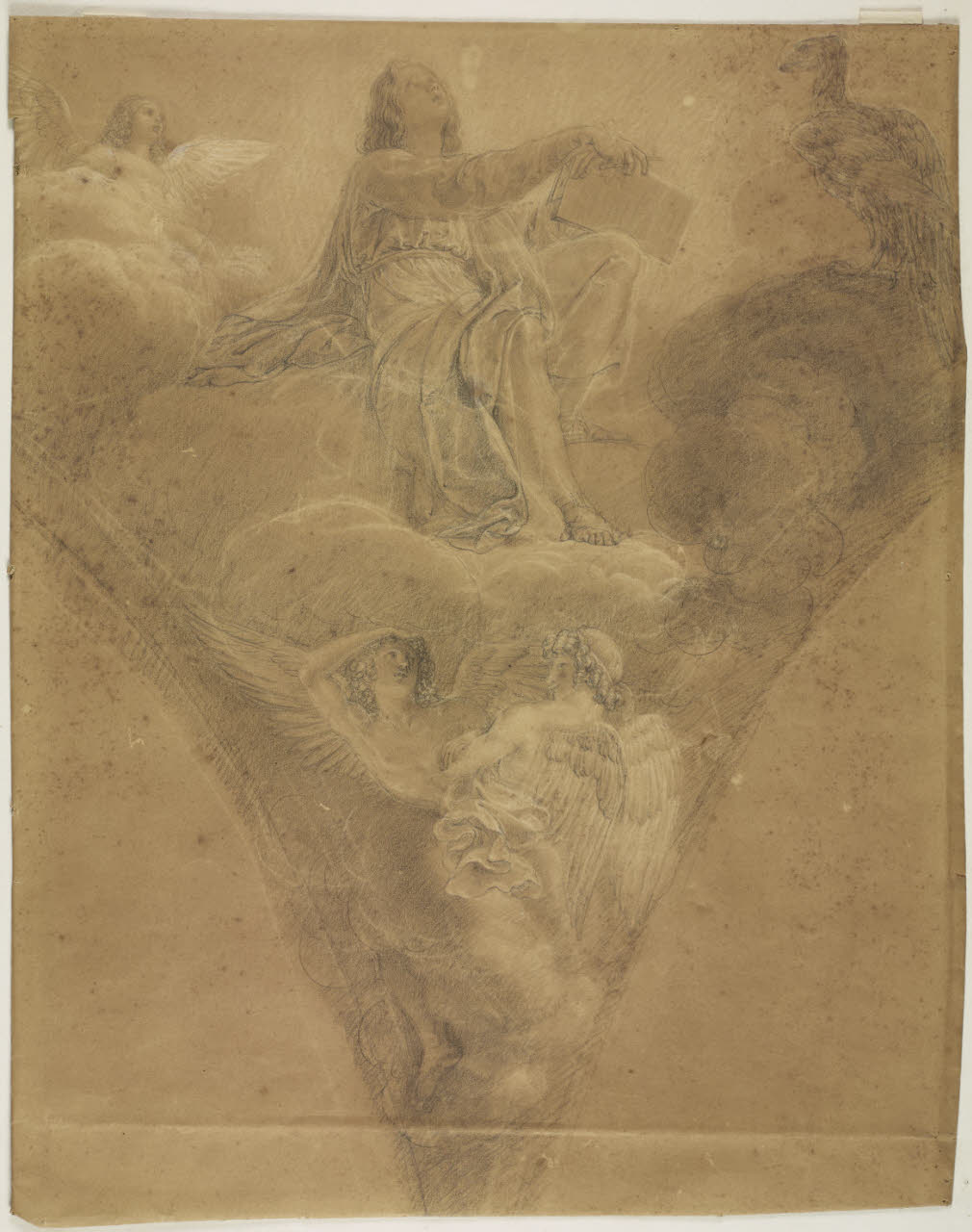 - NOTIZIE STORICO CRITICHE Il disegno, caratterizzato dall'attenta resa luministica e da una coerente impaginazione dello spazio, va considerato una prima idea per il san Giovanni Evangelista affrescato in uno dei pennacchi della cupola di Santa Maria presso San Celso nel 1793. La struttura della scena differisce dalla decorazione finale. La monumentalità dell'evangelista appare ridimensionata; il moto ascensionale, pur evidente, è meno accentuato in virtù di una composizione meno serrata. È possibile riconoscere nel disegno uno studio approntato da Appiani per analizzare l'effetto d'insieme; in questa fase l'attenzione riservata dall'autore alla figura dell'evangelista, fortemente caratterizzata e animata da una profonda carica emozionale, alla ricerca dell'ispirazione divina, prevale sull'equilibrio compositivo, raggiunto comunque nella bilanciata struttura della scena affrescata.