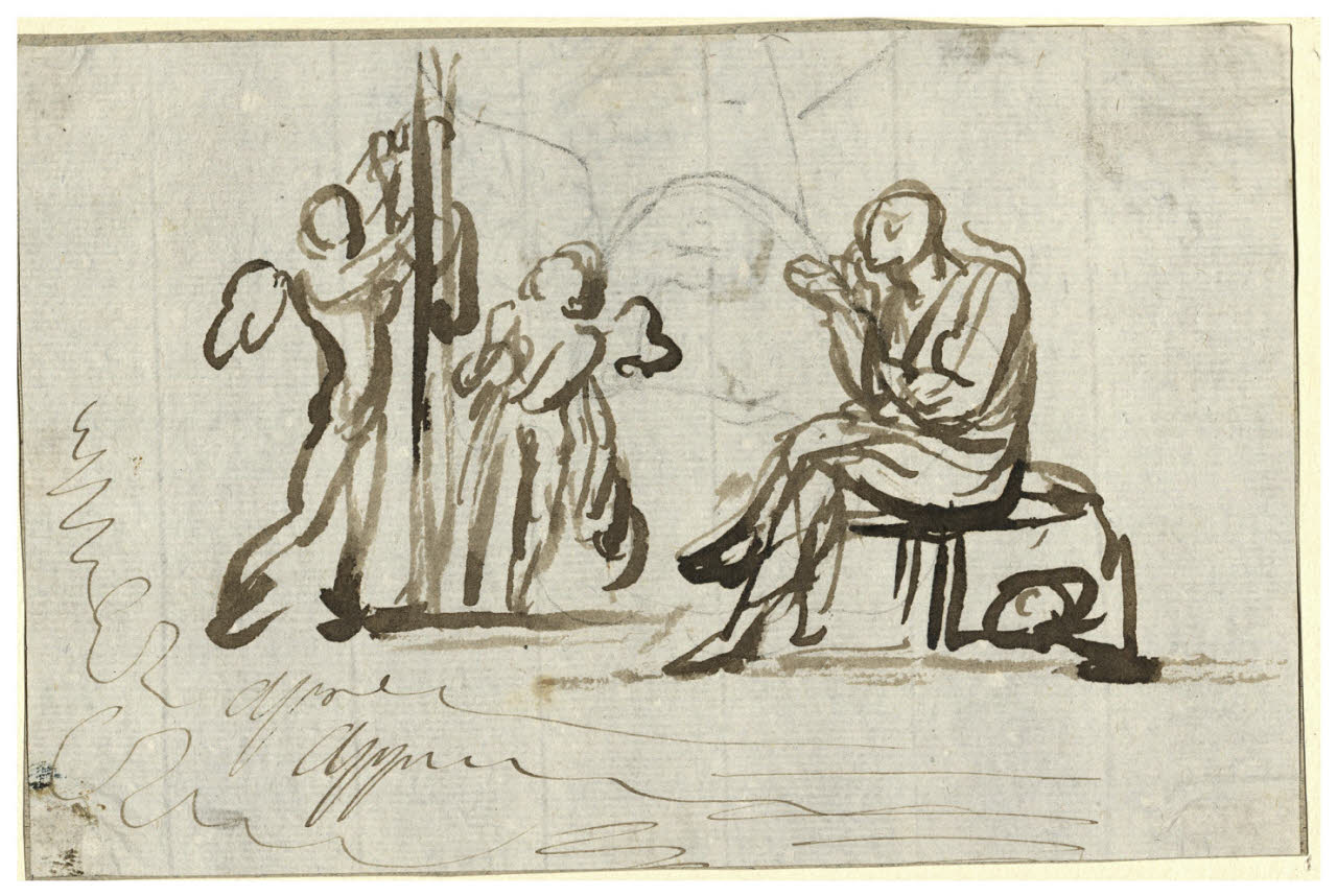 - NOTIZIE STORICO CRITICHE Il disegno, già studiato da Precerutti e correttamente identificato da Sannazzaro, è un primo studio per l'intestazione della carta personale di uno degli esponenti di spicco della Repubblica Cisalpina, ovvero il conte Marco Alessandri, che ricoprì il ruolo di presidente del Direttorio. La particolare iconografia del motivo, precisata da Gennari (p. 329), che ha riconosciuto nell'uomo di destra Socrate, in cui trova spazio anche l'albero della libertà addobbato e curato da due putti, sottende precisi messaggi politici e propagandistici, peculiari del genere. Il pensiero del filosofo, fondato sulla maieutica, si adatta al fondamentale ruolo di Alessandri, le cui virtù devono difendere i principi della Rivoluzione, incarnati dall'albero.