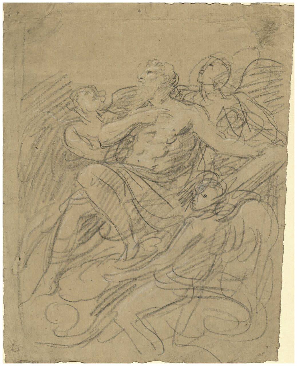- NOTIZIE STORICO CRITICHE Il disegno rappresenta un primo veloce schizzo per uno degli affreschi dei pennacchi della cupola di Santa Maria presso San Celso. Appiani, con uno stile guizzante, è interessato unicamente a impostare la composizione, indagando i rapporti e gli equilibri fra i personaggi. Appare nel tratto impetuoso la foga dell'artista di trasferire con immediatezza i suoi pensieri su carta. Sebbene questo primo studio presenti alcune affinità con il san Marco affrescato nel pennacchio, risulta evidente come Appiani abbia modificato totalmente la posa e l'aspetto degli angeli che circondano la figura.