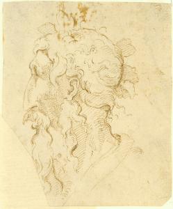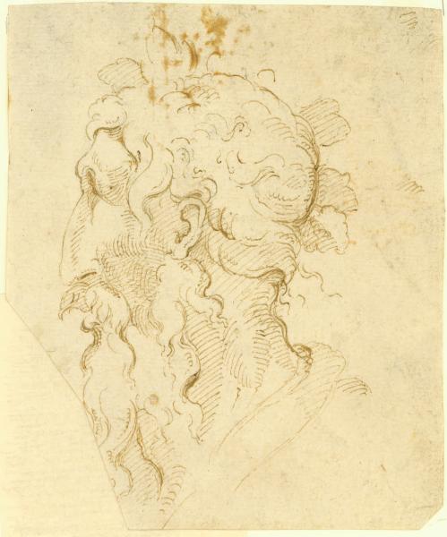 - NOTIZIE STORICO CRITICHE Il soggetto non ha precisi riscontri nella produzione pittorica o grafica di Parmigianino, ma è assolutamente coerente il riferimento alla cerchia del maestro tanto nel modo rapido di utilizzare la tecnica della penna e inchiostro, come per il possibile accostamento ad un nutrito gruppo di disegni con studi teste, alcune delle quali dai tratti decisi caricaturali, lavori che Achim Gann riferisce al periodo romano 1524-1526 (Gnann 2007, nn. 258-277), e in particolare con l'Uomo di profilo con cappello piumato, dal lungo naso appuntito (Chatsworth, Devonshire Collection, inv. 774; Gnann 2007, I, p. 392, n. 277, II, p. 249), che nella versione incisa all'acquaforte da Lucas Vorsterman il Giovane il Giovane (1624-1668 circa), porta il titolo: "L'Archi Buffon di Parma" (Mussini, De Rubeis 2003, p. 141, n. 258). \nPer l'accentuato carattere grottesco, nell'inventario storico del Gabinetto dei Disegni (uno schedario dattiloscritto anche conosciuto come "Inventario Nicodemi") la testa recava un'originaria attribuzione al milanese Giuseppe Arcimboldo (1527-1593), in seguito corretta in una forma dubitativa (tramite l'aggiunta a matita, sulla relativa scheda, di un "?"). Il riferimento alla "Cerchia di Parmigianino" è recente, formulato in occasione della mostra Simone Peterzano al Castello Sforzesco di Milano (2012), come risultato di una prima disamina del nucleo collezionistico di provenienza.\n(A. Alberti in "De visi mostruosi", 2023)
