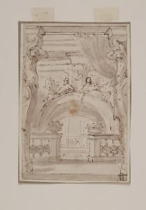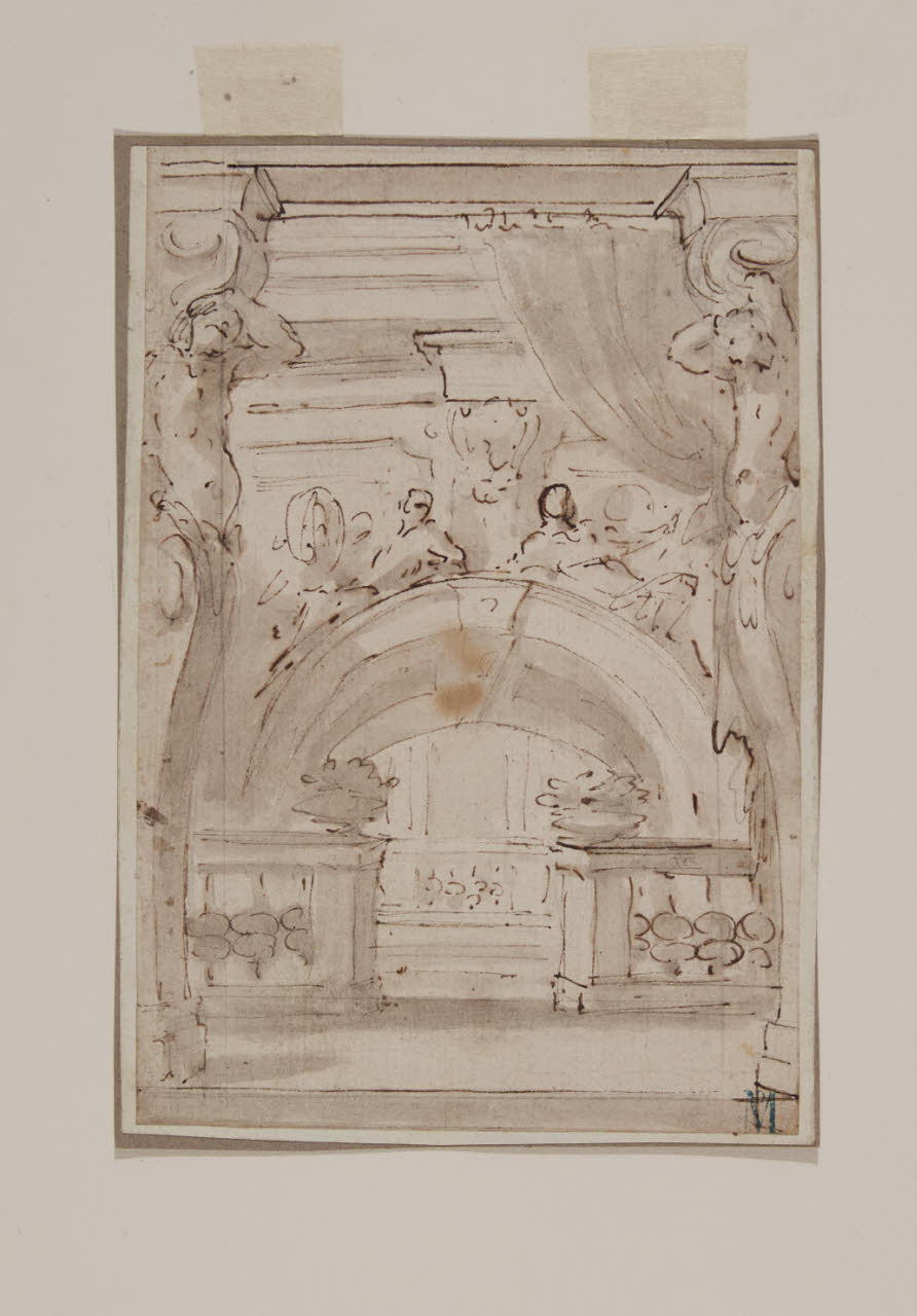 Decorazione scenografica con telamoni, arcone, balaustra. Decorazione scenografica con telamoni, arcone, balaustra