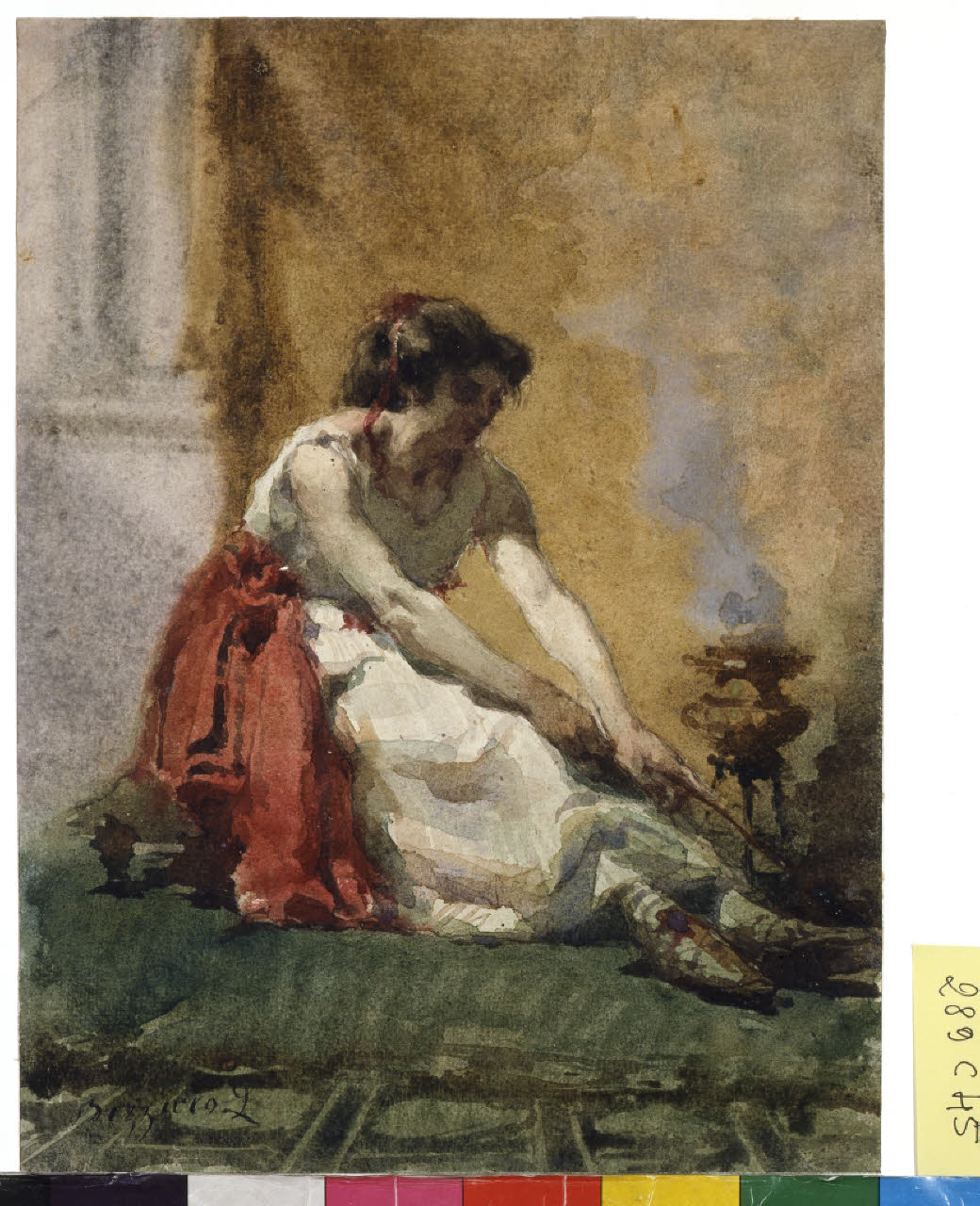 - NOTIZIE STORICO CRITICHE Già appartenuto alla collezione di Pompeo Mariani, questo foglio di Leonardo Bazzaro dovrebbe collocarsi attorno al 1880 quando, dopo aver studiato all'Accademia di Brera e alla scuola di Giuseppe Bertini, iniziò la sua attività con una serie di dipinti di interni. In questo periodo eseguì inoltre qualche studio di figura, come quello in esame, vivacemente colorato e chiaroscurato. Il foglio raffigura una giovane donna seduta a terra accanto ad un tripode con incensiere, in cui sembra trasparire un certo gusto orientaleggiante nella scelta del soggetto.