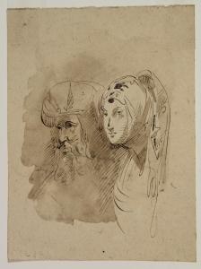 Una testa maschile e una femminile con copricapi di foggia orientale. Una testa maschile e una femminile con copricapi di foggia orientale