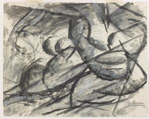 carboncino, inchiostro nero a pennello e tempera bianca su carta