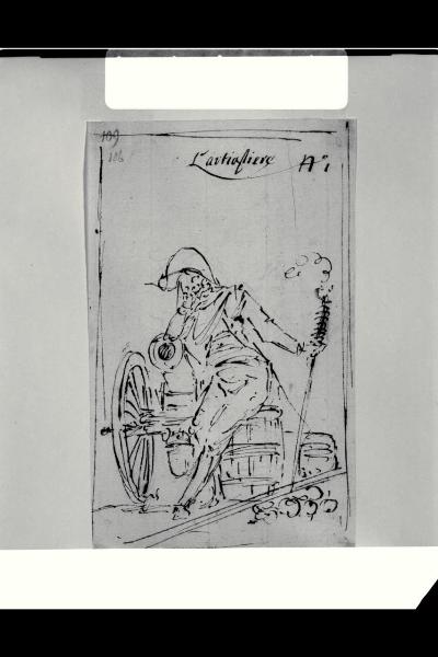 Artigliere come scheletro poggiato al cannone e con buttafuoco acceso