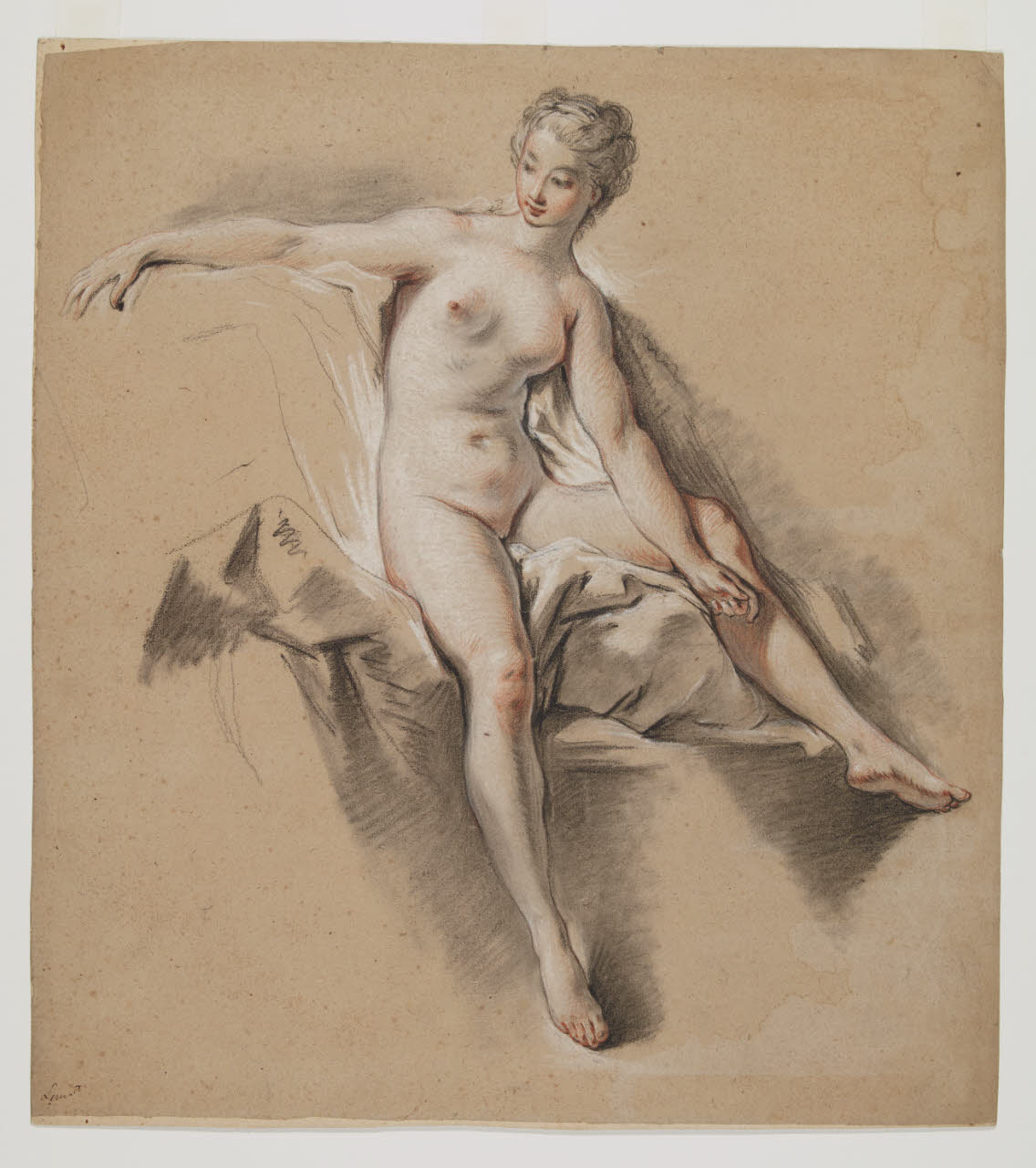 - NOTIZIE STORICO CRITICHE Questo studio di nudo femminile fa parte di un gruppo di disegni di scuola francese collezionati dal principe Alberico XII Barbiano di Belgioioso e pervenuti nelle civiche collezioni nel 1943 per dono della famiglia Trivulzio. Il foglio mostra infatti un soggetto tipico del genere erotico-galante molto in voga sotto Luigi XV e il regno della marchesa di Pompadour che vide in François Boucher uno dei massimi rappresentanti. Françoise Joulie data questo tipo di produzione attorno al 1735-1740, quando Boucher di ritorno dall'Italia venne nominato membro dell'Académie royale de peinture et de sculpture (cfr. François Boucher. Fragments of a World Picture, exhib. cat., Copenhagen, 2013, p. 92). Per realizzare le sue composizioni dipinte, Boucher ha bisogno di produrre un gran numero di studi e schizzi. Il foglio del Castello Sforzesco sembra divergere da questa prassi per le sue notevoli dimensioni, inoltre, il tratto a carboncino, combinato con l'uso della matita rossa e del gessetto bianco, differisce dalle tecniche solitamente impiegate da Boucher per i suoi nudi delicati, tanto da far pensare alla mano di un allievo della sua cerchia. La posa sensuale, ma al contempo poco spontanea della donna, la mancata evanescenza del tipico incarnato perlaceo e la resa grossolana delle ombreggiature del drappeggio sul quale è seduta la modella, rafforzano l'idea che si tratti qui di un seguace di Boucher.