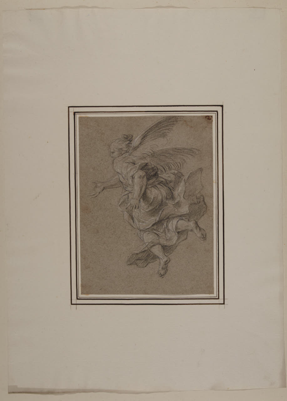 - NOTIZIE STORICO CRITICHE Il disegno fa parte di un nucleo di 34 fogli, alcuni dei quali noti agli studi, tutti realizzati a matita nera e gessetto bianco su carta grigia (eccezion fatta per uno, a matita rossa e gessetto bianco sempre su carta grigia). Tra questi, alcuni recano un'iscrizione attributiva di Giuseppe Bossi e un numero a penna; a livello stilistico (come confermato anche nei casi dei disegni pubblicati), la serie è ascrivibile alla mano del pittore barocco lombardo Antonio Busca. \nNell'inventario del 1814 dei beni di Alberico XII Barbiano di Belgioioso (trascritto in M. Forni, "Abitare da principe. Le residenze e le collezioni di Alberico XII Barbiano di Belgiojoso", 2020), nella Cartella G "che contiene i disegni antichi" sono registrati "33 tutti del Busca", stimati £ 66.