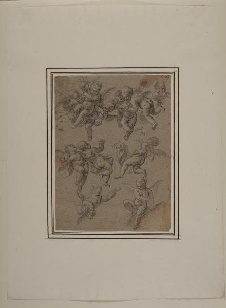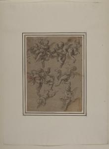 - NOTIZIE STORICO CRITICHE Il disegno fa parte di un nucleo di 34 fogli, alcuni dei quali noti agli studi, tutti realizzati a matita nera e gessetto bianco su carta grigia (eccezion fatta per uno, a matita rossa e gessetto bianco sempre su carta grigia). Tra questi, alcuni recano un'iscrizione attributiva di Giuseppe Bossi e un numero a penna; a livello stilistico (come confermato anche nei casi dei disegni pubblicati), la serie è ascrivibile alla mano del pittore barocco lombardo Antonio Busca. \nRifacendosi a quanto pubblicato da Rossi (1959), Bruzzese (2017) avvicina il foglio agli affreschi della chiesetta della Madonnina in Prato di Biumo Inferiore (Varese).\nNell'inventario del 1814 dei beni di Alberico XII Barbiano di Belgioioso (trascritto in M. Forni, "Abitare da principe. Le residenze e le collezioni di Alberico XII Barbiano di Belgiojoso", 2020), nella Cartella G "che contiene i disegni antichi" sono registrati "33 tutti del Busca", stimati £ 66.