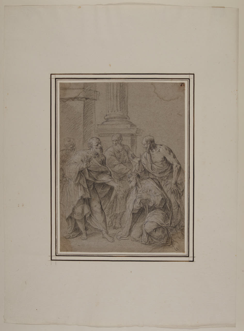 - NOTIZIE STORICO CRITICHE Il disegno fa parte di un nucleo di 34 fogli, alcuni dei quali noti agli studi, tutti realizzati a matita nera e gessetto bianco su carta grigia (eccezion fatta per uno, a matita rossa e gessetto bianco sempre su carta grigia). Tra questi, alcuni recano un'iscrizione attributiva di Giuseppe Bossi e un numero a penna; a livello stilistico (come confermato anche nei casi dei disegni pubblicati), la serie è ascrivibile alla mano del pittore barocco lombardo Antonio Busca. \nIdentificato da S. Bruzzese (2017) come foglio di studio per l'affresco nella cappella di San Siro alla Certosa di Pavia. Presso il Gabinetto dei Disegni del Castello Sforzesco si conserva anche lo studio per l'altra scena affrescata nella cappella: "Il giovane Siro che offre a Cristo i pani e i pesci per la moltiplicazione" (inv. C 149/3).\nNell'inventario del 1814 dei beni di Alberico XII Barbiano di Belgioioso (trascritto in M. Forni, "Abitare da principe. Le residenze e le collezioni di Alberico XII Barbiano di Belgiojoso", 2020), nella Cartella G "che contiene i disegni antichi" sono registrati "33 tutti del Busca", stimati £ 66.