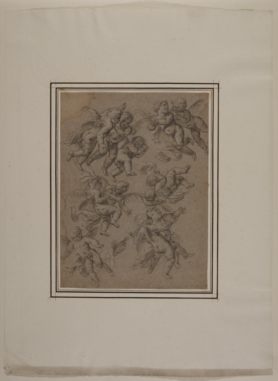 - NOTIZIE STORICO CRITICHE Il disegno fa parte di un nucleo di 34 fogli, alcuni dei quali noti agli studi, tutti realizzati a matita nera e gessetto bianco su carta grigia (eccezion fatta per uno, a matita rossa e gessetto bianco sempre su carta grigia). Tra questi, alcuni recano un'iscrizione attributiva di Giuseppe Bossi e un numero a penna; a livello stilistico (come confermato anche nei casi dei disegni pubblicati), la serie è ascrivibile alla mano del pittore barocco lombardo Antonio Busca. \nNell'inventario del 1814 dei beni di Alberico XII Barbiano di Belgioioso (trascritto in M. Forni, "Abitare da principe. Le residenze e le collezioni di Alberico XII Barbiano di Belgiojoso", 2020), nella Cartella G "che contiene i disegni antichi" sono registrati "33 tutti del Busca", stimati £ 66.