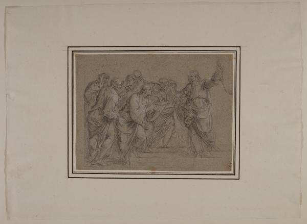 - NOTIZIE STORICO CRITICHE Il disegno fa parte di un nucleo di 34 fogli, alcuni dei quali noti agli studi, tutti realizzati a matita nera e gessetto bianco su carta grigia (eccezion fatta per uno, a matita rossa e gessetto bianco sempre su carta grigia). Tra questi, alcuni recano un'iscrizione attributiva di Giuseppe Bossi e un numero a penna; a livello stilistico (come confermato anche nei casi dei disegni pubblicati), la serie è ascrivibile alla mano del pittore barocco lombardo Antonio Busca. \nIl foglio è un disegno preparatorio per il dipinto, di analogo soggetto, facente parte del ciclo per la sala dei senatori all'interno del palazzo Ducale, serie commissionata da Bartolomeo III Arese, presidente del Senato di Milano. Le tele sono poi confluite alla Pinacoteca di Brera; il quadro con "Cristo e la moneta del tributo" è oggi in deposito presso la chiesa milanese di San Marco. Il disegno in analisi presenta un linguaggio oramai autonomo e ben definito, giunto nel pieno della sua maturità (Bruzzese 2017).\nNell'inventario del 1814 dei beni di Alberico XII Barbiano di Belgioioso (trascritto in M. Forni, "Abitare da principe. Le residenze e le collezioni di Alberico XII Barbiano di Belgiojoso", 2020), nella Cartella G "che contiene i disegni antichi" sono registrati "33 tutti del Busca", stimati £ 66.