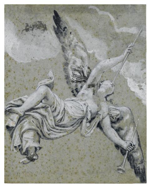 - NOTIZIE STORICO CRITICHE Inventariato dubbiamente come disegno di Paolo Veronese o Battista Zelotti, il foglio in questione è citato da Tietze (1944) come copia di bottega dalla "Fama" affrescata da Paolo Veronese sul soffitto di una sala di Villa Soranzo (affresco oggi staccato e conservato nella Sacrestia della Cattedrale di Castelfranco). A causa delle sottili lumeggiature a biacca e della qualità maggiore rispetto agli altri disegni della serie, secondo Arslan (1948) potrebbe essere stato eseguito direttamente da Veronese, mentre Gisolfi (1987) sposta l'attribuzione verso un anonimo copista tardo-cinquecentesco degli affreschi di Veronese a Villa Soranzo.