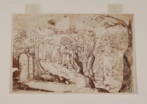 Paesaggio con rovine e un paese. Paesaggio con rovine e un paese