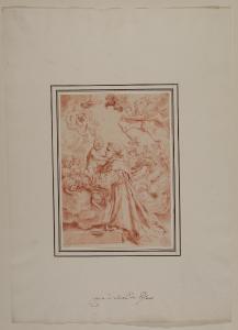 - NOTIZIE STORICO CRITICHE Appartenuto alle collezioni d'arte della famiglia Trivulzio, il disegno in esame reca sul montaggio un'attribuzione manoscritta di Giuseppe Bossi a Simone Cantarini che venne recepita in maniera dubitativa nell'inventario storico del museo. Il foglio mostra Sant'Antonio da Padova genuflesso di profilo verso sinistra in adorazione del Bambino che con entrambe le mani lo accarezza sotto al mento. Lo sfondo è occupato da una gloria di angeli e cherubini. La composizione riproduce nello stesso verso un'acquaforte del Cantarini, per la quale Bellini propone una datazione per via stilistica al 1639 (cfr. Bellini 1980, p. 109 n. 26). Lo stesso studioso menzionava nel catalogo dell'opera incisa di questo artista sette disegni aventi un soggetto analogo, tra cui questo del Castello Sforzesco, senza però indicarne un'eventuale autografia. Ambrosini Massari ha definitivamente espunto il foglio in esame dal corpus grafico di Cantarini, sottolineandone però come le numerose copie ancora esistenti testimonino dell'immediata fortuna riscossa dal modello del Pesarese, insitendo inoltre sui debiti di invenzioni come questa del Cantarini per i suoi seguaci quali Flaminio Torri e Lorenzo Pasinelli (Ambrosini Massari 1997, p. 336, sub. III.20).