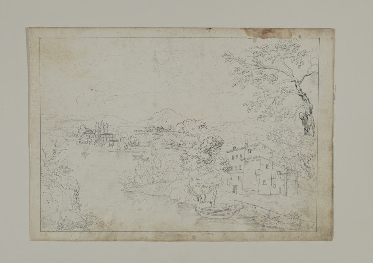 Paesaggio con casa colonica sulla riva di un fiume e monti in lontananza. Paesaggio con casa colonica sulla riva di un fiume e monti in lontananza