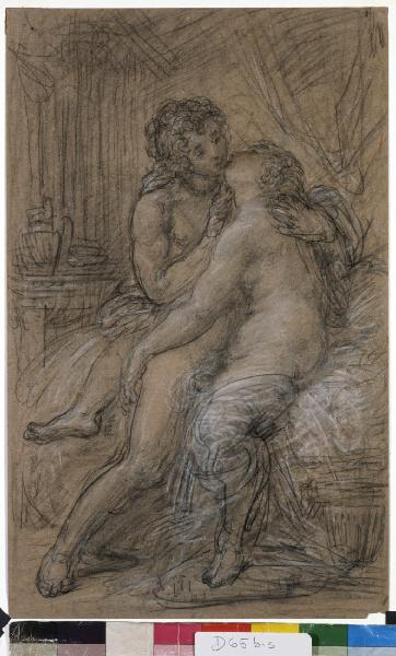matita, gessetto bianco e sanguigna su carta ocra rosata
