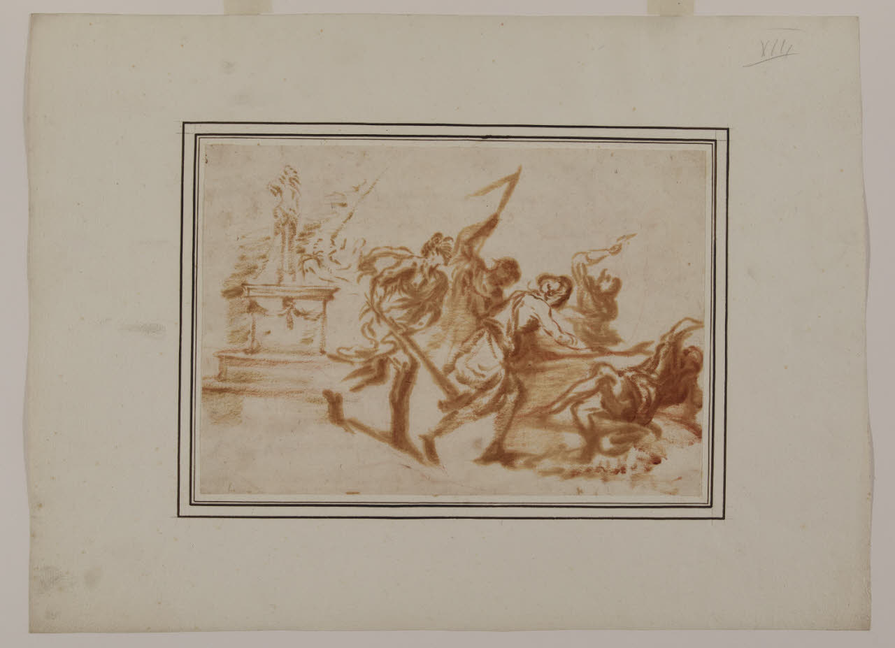 - NOTIZIE STORICO CRITICHE Nel 1944 Nicodemi attribuisce questo nucleo di undici disegni alla maturità di Giovanni Battista Castiglione, detto il Grechetto (curiosamente, non pubblica il foglio Au. D 65/13). Nel 2000 Morandotti inserisce i dodici disegni nel catalogo di Antonio Lagorio, tra i seguaci del genovese Valerio Castello. Notevole è la sintonia tra l'attività da disegnatore di Lagorio e le opere grafiche del Grechetto, come evidenziato non solo dai disegni del Castello Sforzesco, ma anche da un "Sant'Antonio che benedice una giovane donna inginocchiata" a pennello e olio su carta, passato all'asta da Sotheby's di New York il 12 gennaio 1994 (come opera genovese del Seicento) e rivisto nell'asta Finarte di Milano il 22 novembre 2000 (attribuito al Grechetto), appartenente quest'ultimo a padre Sebastiano Resta (Morandotti 2000). Tutti questi tredici fogli sono, secondo Morandotti, attribuibili a Lagorio per caratteristiche comuni quali la simile tecnica esecutiva, le tipologie dei volti, le scelte cromatiche. Nella scheda digitale è stata inserita, in epoca imprecisata, un'attribuzione dubitativa al pittore barocco genovese Giovanni Battista Merano (1632-1698).