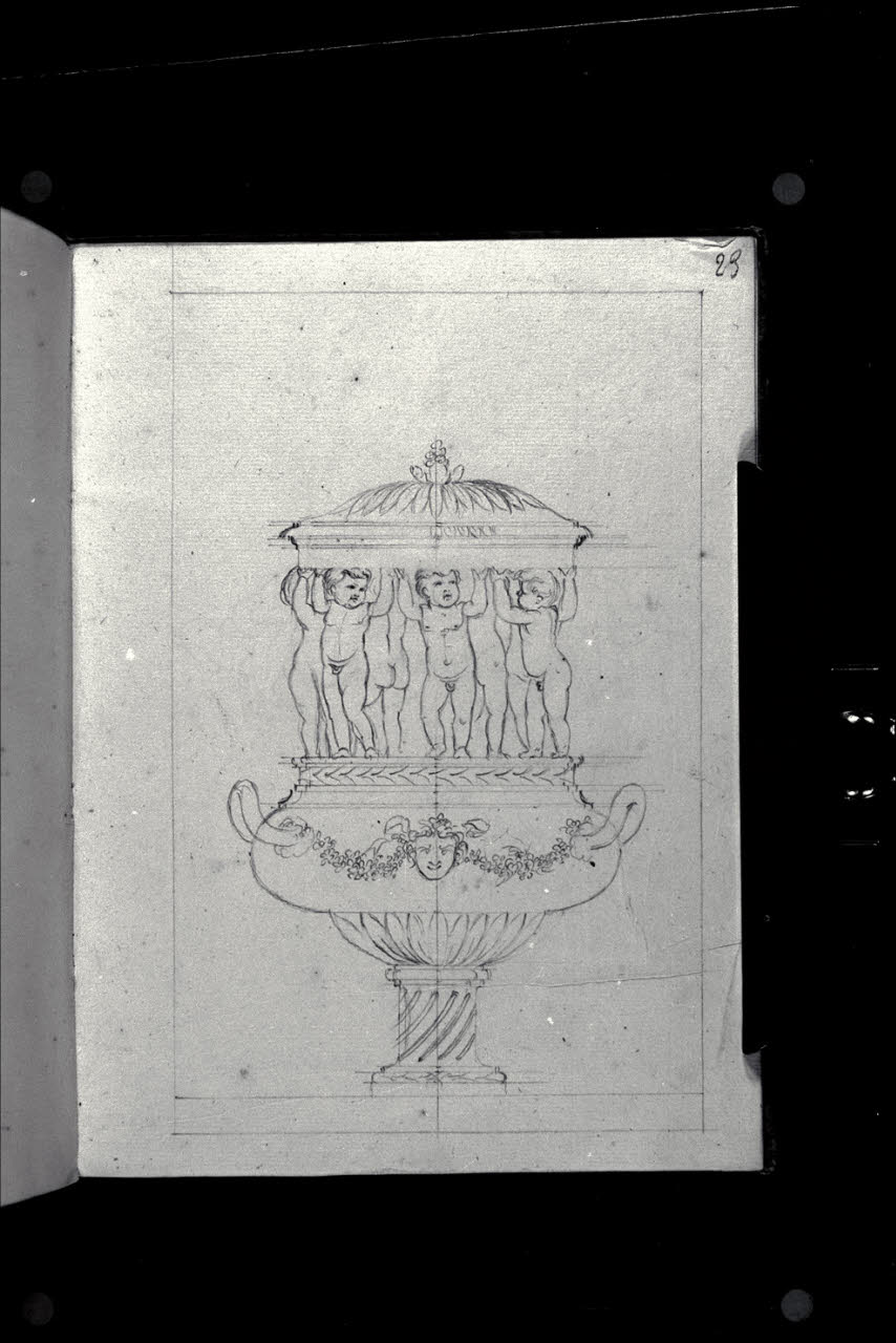 Idee di varii vasi: Vaso con coperchio sollevato da putti